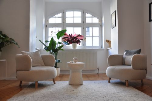 Couch und Sessel im Therapieraum. Hier findet der gemeinschaftliche Teil der Arbeit von Psychotherapeutin in Ausbildung unter Supervision Verica Mitrovic mit ihren Patient*innen statt.