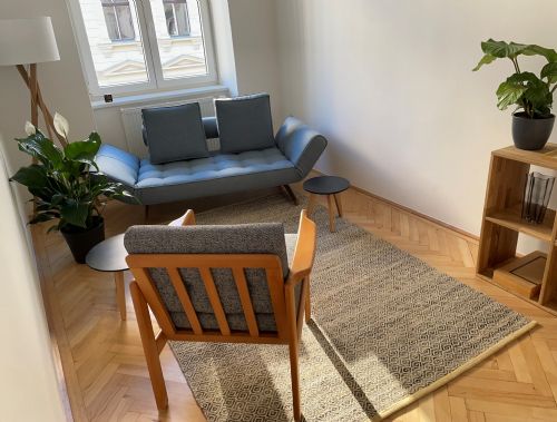 Unser großer heller Praxisraum in der Schwaigergasse 35. Gemütlich, klar, ruhig. Richtig gut geeignet zum intensiven Arbeiten.