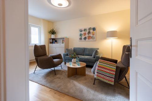 Couch und Sessel im Therapieraum. Hier findet der gemeinschaftliche Teil der Arbeit von Psychotherapeutin in Ausbildung unter Supervision Verica Mitrovic mit ihren Patient*innen statt.