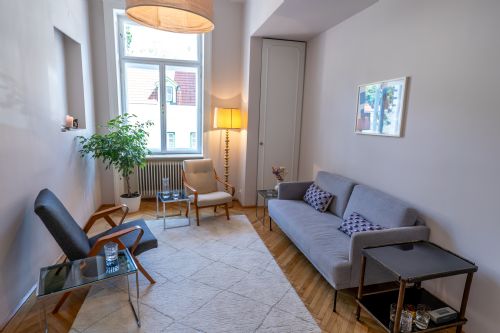 Couch und Sessel im Therapieraum. Hier findet der gemeinschaftliche Teil der Arbeit von Psychotherapeutin in Ausbildung unter Supervision Verica Mitrovic mit ihren Patient*innen statt.