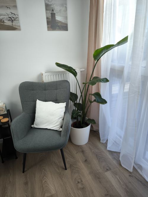 Couch und Sessel im Therapieraum. Hier findet der gemeinschaftliche Teil der Arbeit von Psychotherapeutin in Ausbildung unter Supervision Verica Mitrovic mit ihren Patient*innen statt.