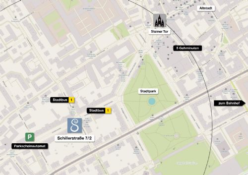 Meine Praxis in Krems an der Donau ist zentral gelegen, und sowohl mit öffentlichen Verkehrsmitteln, als auch dem Auto sehr gut zu erreichen. (Plandaten: OpenStreetMap)